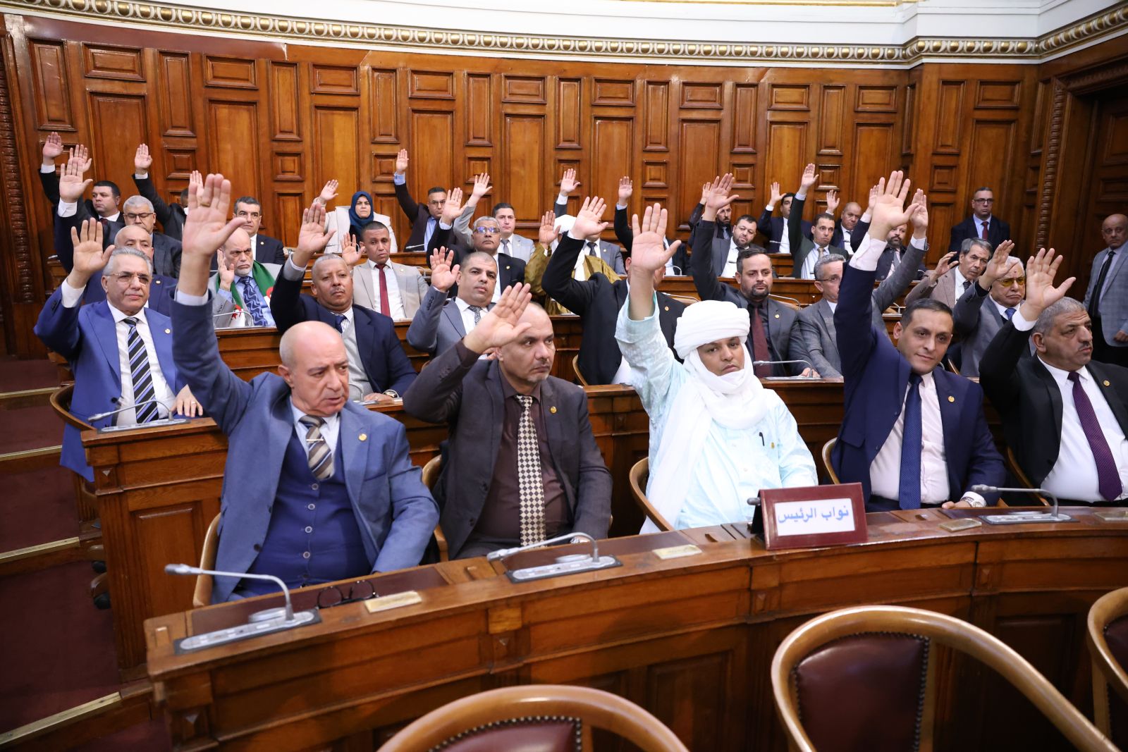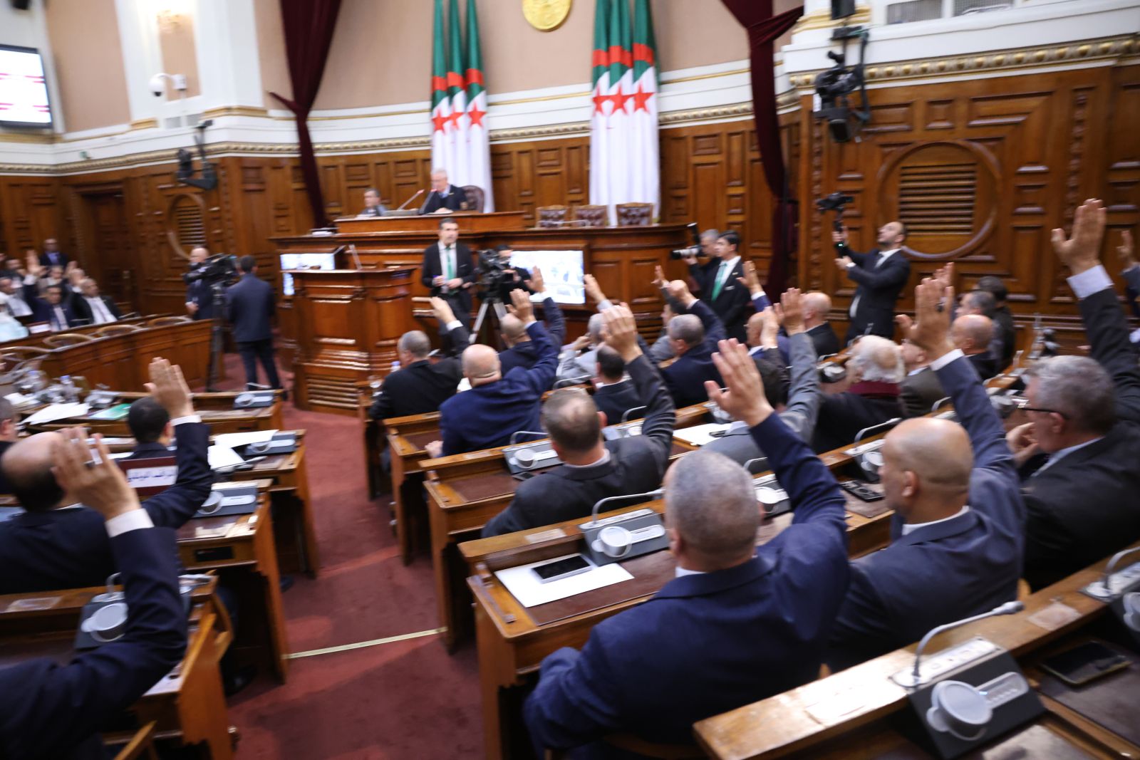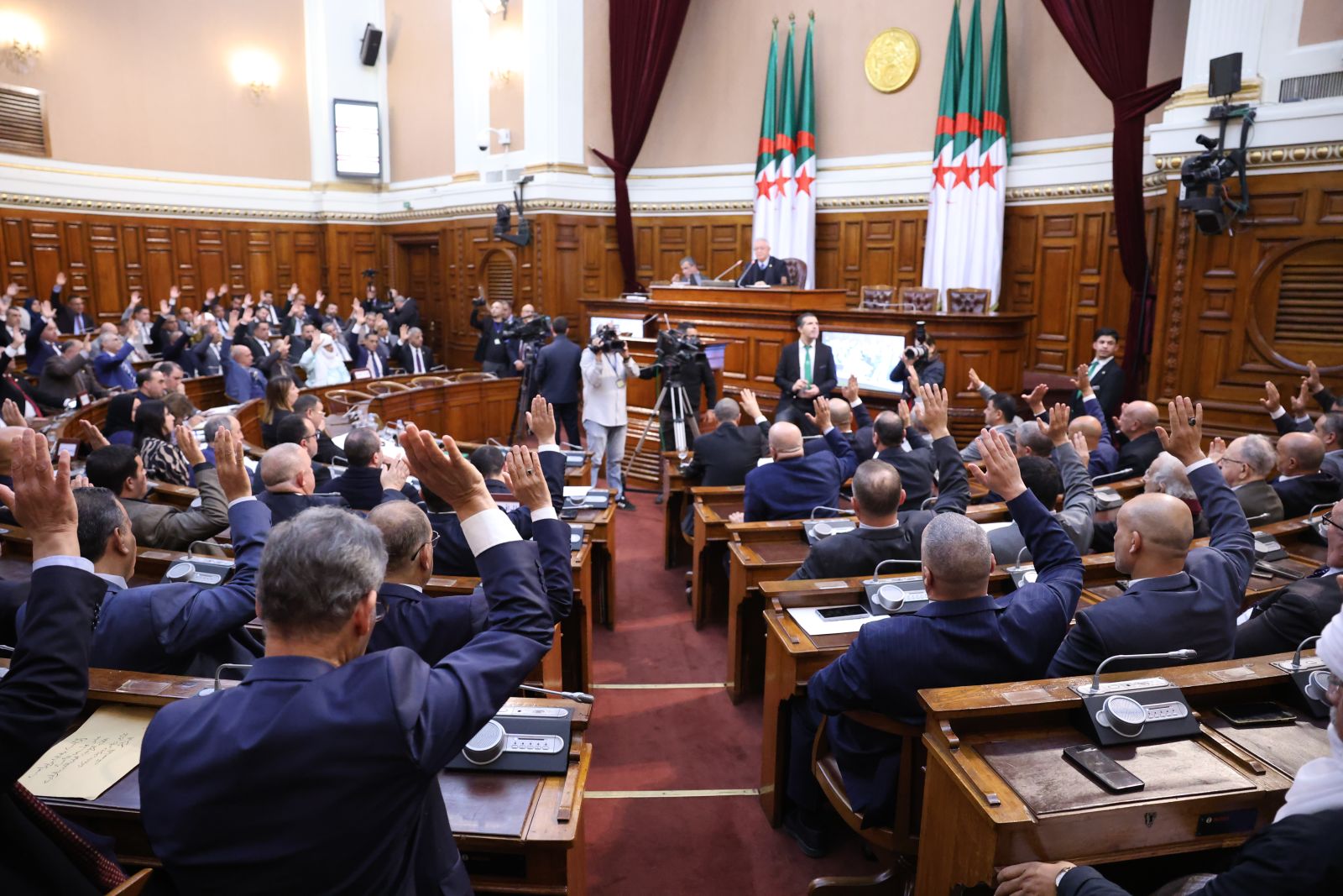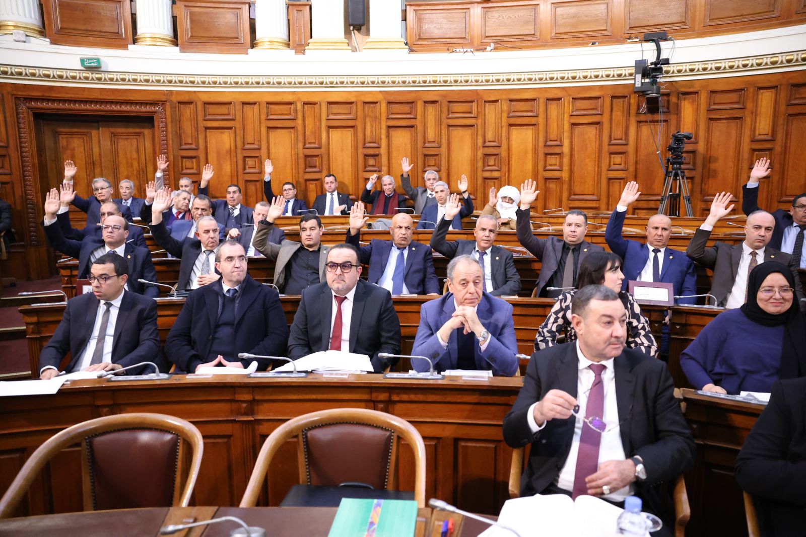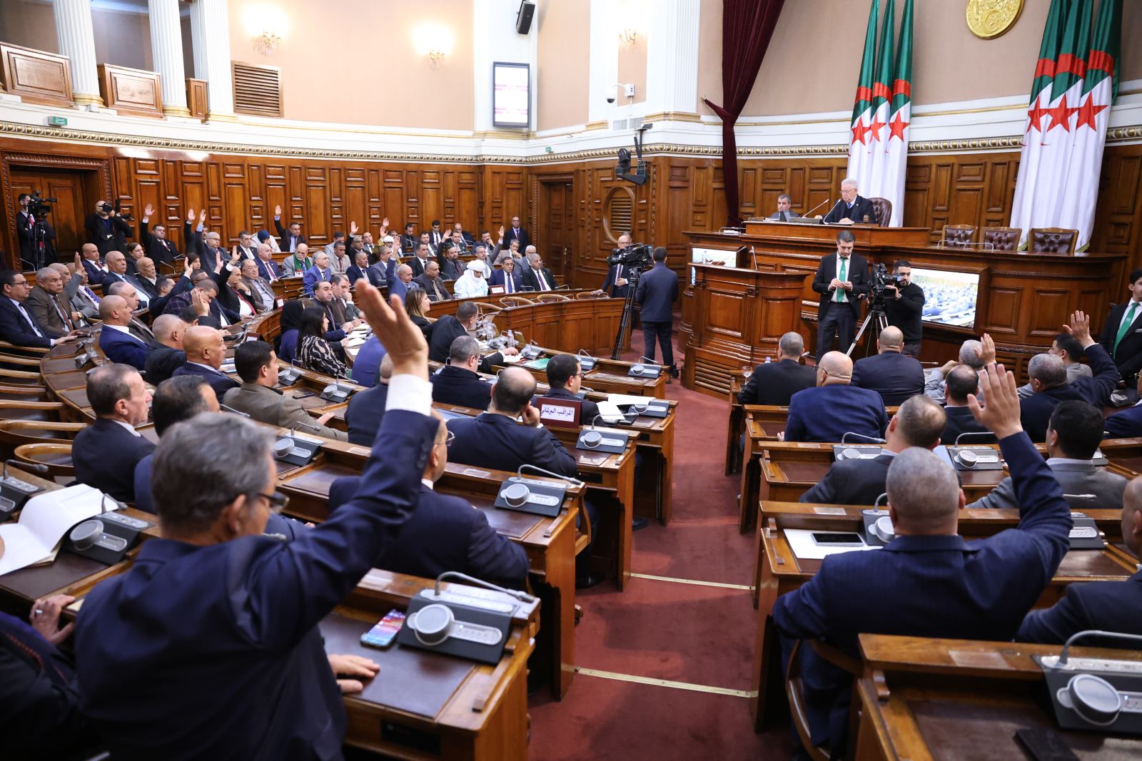 في جلسة علنية تراسها السيد عزوز ناصري، رئيس مجلس الأمة أعضاء المجلس يصوتون على مشروع القانون الذي يُعدّل ويُتمّم القانون رقم 84-09، والمتعلق بالتنظيم الإقليمي للبلاد