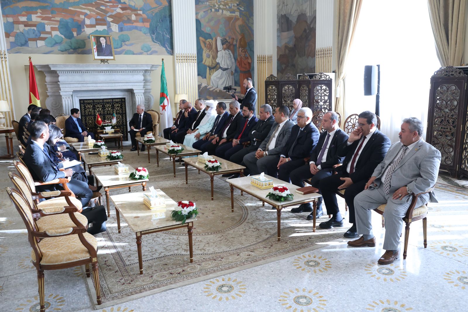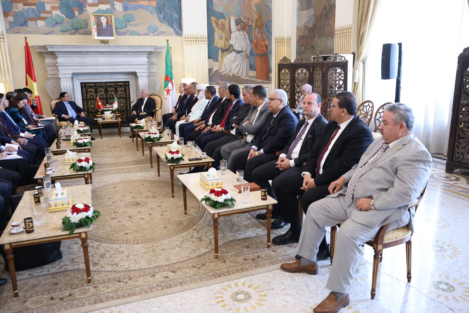 في مستهل اللقاء، رحب السيد رئيس مجلس الأمة بالسيد فام مينه شينه والوفد رفيع المستوى المرافق له، معبرًا عن تقديره لهذا اللقاء الرسمي الذي يعكس متانة الشراكة الثنائية، والعمق التاريخي للعلاقات الجزائرية – الفيتنامية المبنية على تجارب نضالية مشتركة ضد الاستعمار والدفاع المستميت عن السيادة الوطنية. هذه العلاقات المبنية على الصداقة والتعاون والتضامن توجت بالأمس بالإعلان عن الشراكة الاستراتيجية بين البلدين.